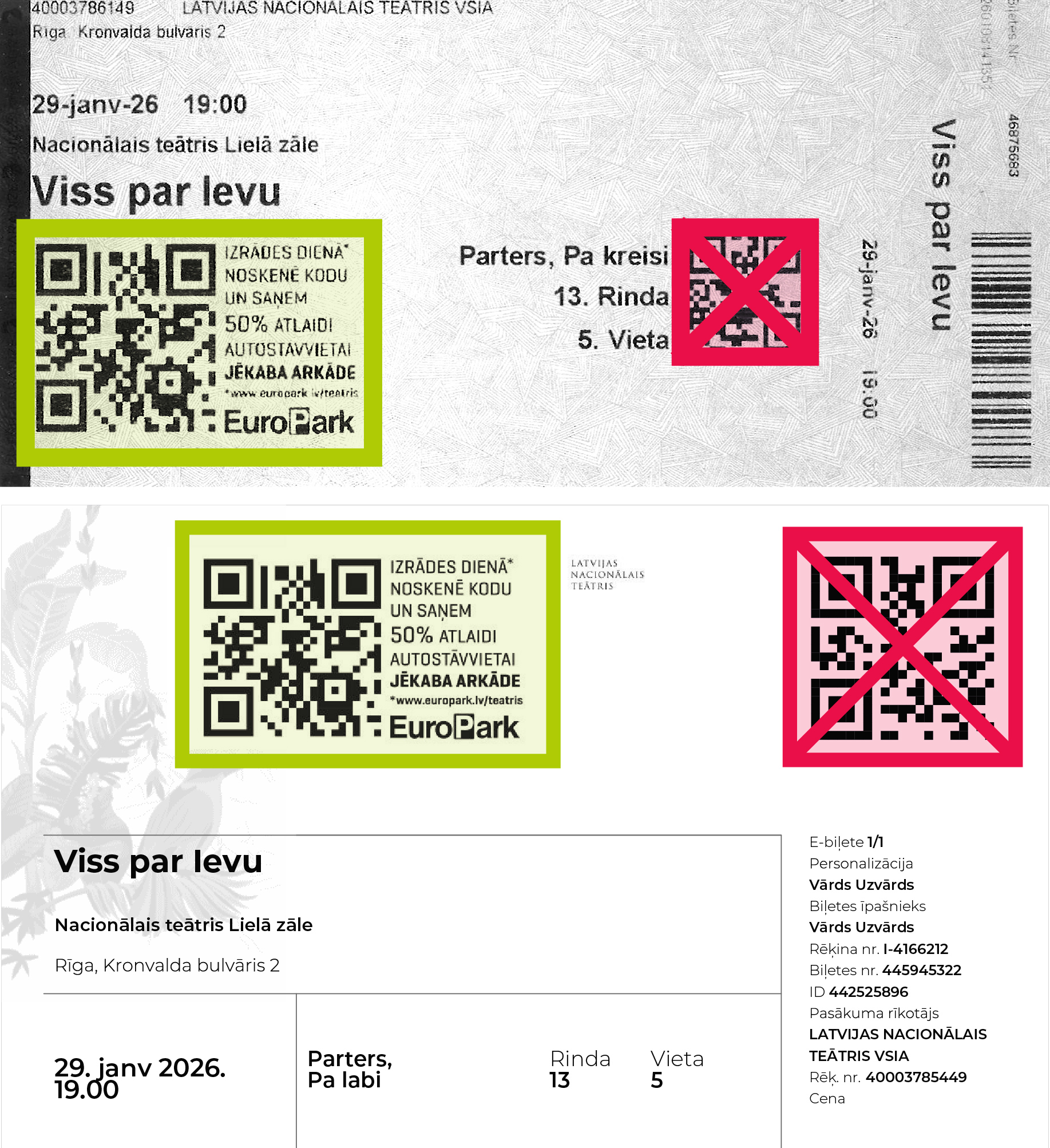 - 50% atlaižu QR kods derīgs lietošanai vienu reizi tikai uz Latvijas Nacionālā teātra izrādes biļetes norādītajā datumā (līdz plkst. 23:59). Veicot apmaksu par autostāvvietu pēc attiecīgās dienas plkst. 24:00, atlaide autostāvvietas izmantošanai netiek piemērota.
