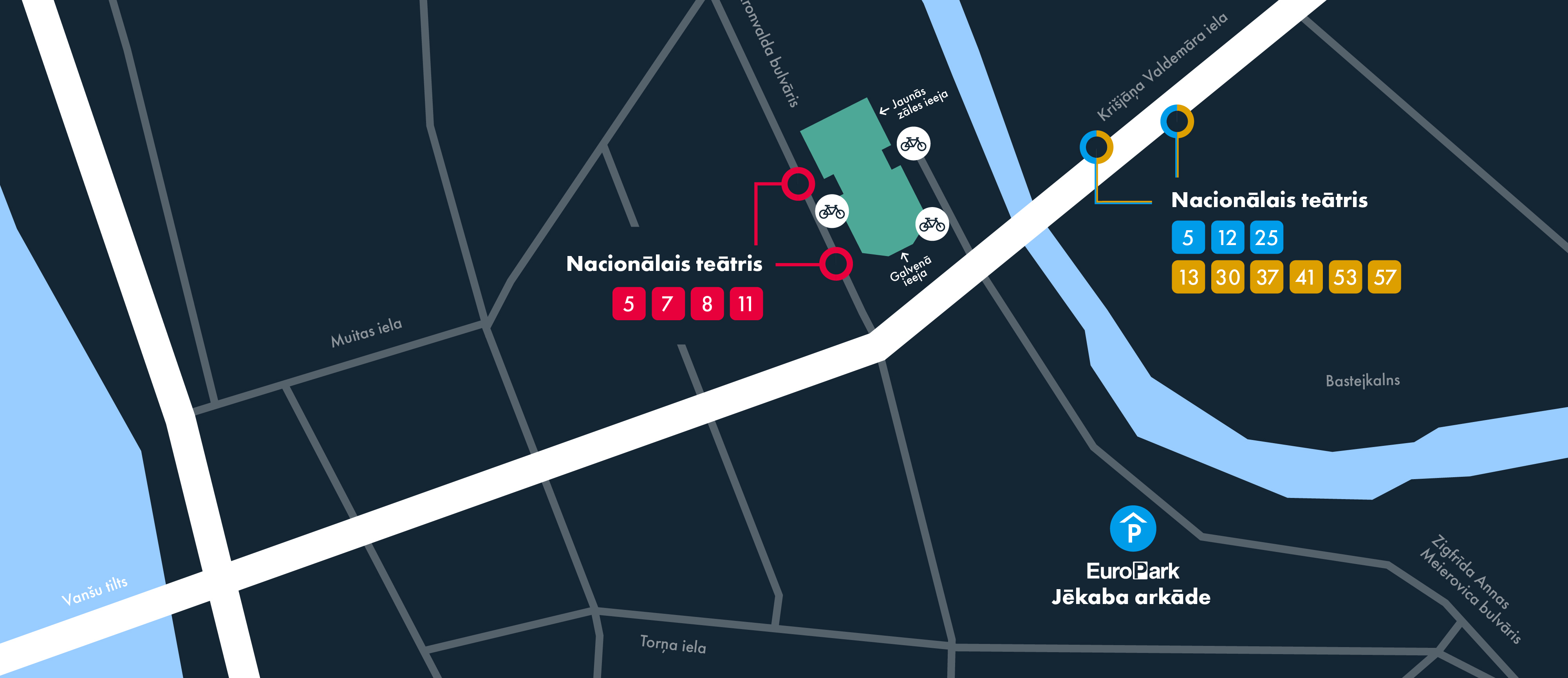 Latvijas Nacionālais teātris ir ērti sasniedzams ar velosipēdu, ko var novietot kādā no mūsu velonovietnēm.