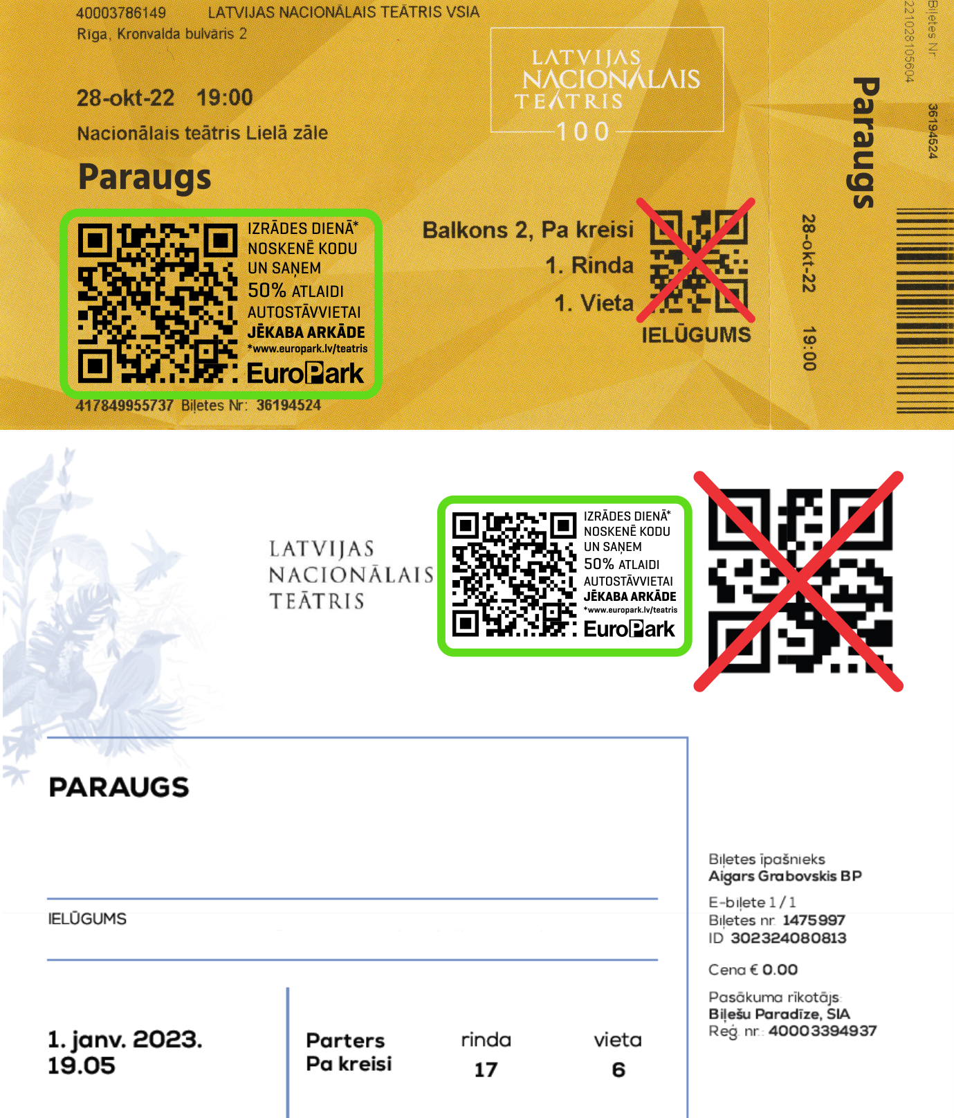 - 50% atlaižu QR kods derīgs lietošanai vienu reizi tikai uz Latvijas Nacionālā Teātra izrādes biļetes norādītajā datumā (līdz plkst. 24:00). Veicot apmaksu par autostāvvietu pēc attiecīgās dienas plkst. 24:00, atlaide autostāvvietas izmantošanai netiek piemērota.